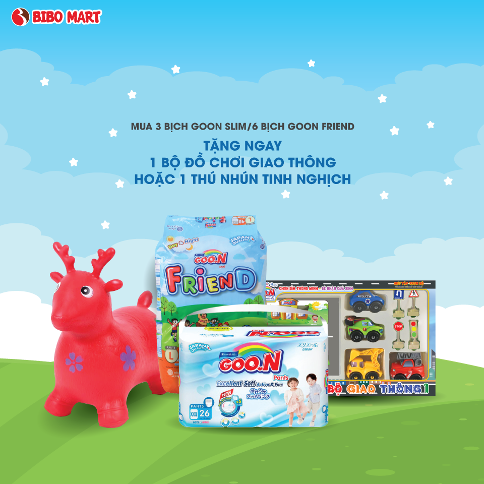 Mua 3 bịch GOO.N Slim đại hoặc 6 bịch GOO.N Friend đại Tặng 1 Bộ đồ chơi giao thông sáng tạo hoặc 1 thú nhún hình chú tuần lộc.