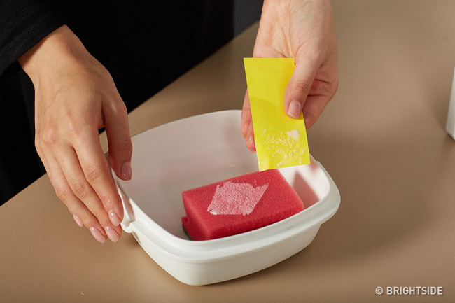Khi một đứa trẻ muốn tạo ra một điều gì đó mang tính nghệ thuật, nó thường dùng hết cả lọ keo chỉ trong 5 phút và bôi lên mọi thứ xung quanh. Để tránh tình trạng này, bố mẹ hãy lấy một cái hộp, đặt một miếng bọt biển ướt bên trong và đổ một ít keo lên đó. Bây giờ trẻ có thể chỉ cần cho giấy lướt qua miếng bọt biển để lấy keo.