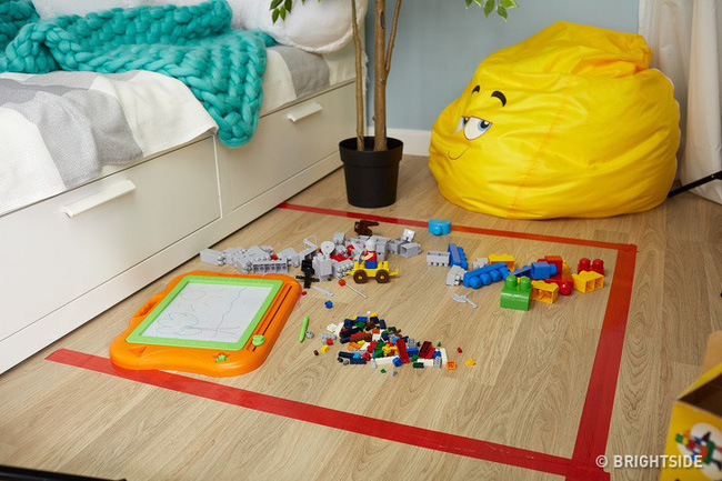 Trẻ em thích vứt đồ chơi quanh nhà. Bố mẹ hãy thử mẹo này: chọn một nơi mà một đứa trẻ có thể chơi và đánh dấu nó với băng dán. Giải thích cho trẻ có quy tắc mới: không được đặt đồ chơi ngoài khu vực này.
