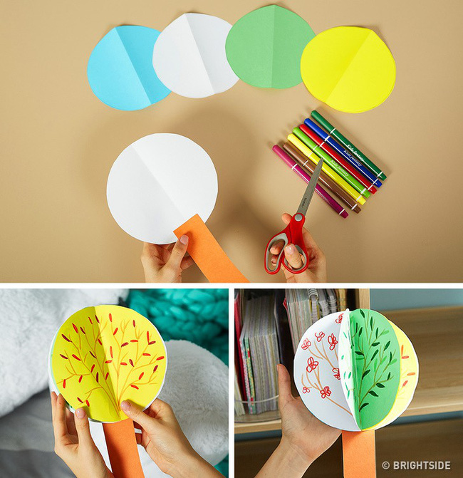 – Mỗi vòng tròn là một mùa, do đó, bố mẹ cần trang trí cho phù hợp. Ví dụ, thêm tuyết cho mùa đông, chồi, hoa cho mùa xuân, lá xanh, lá vàng cho mùa hè và cho mùa thu.