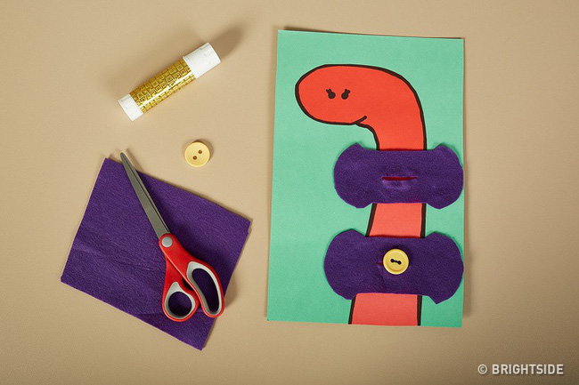 Bố mẹ có thể làm trò chơi vui nhộn này để dạy cho trẻ cách cài cúc và mở cúc. Cắt một con giun ra khỏi giấy màu, may các cúc trên đó và dán các miếng vải mềm với những vết cắt nhỏ trong đó.