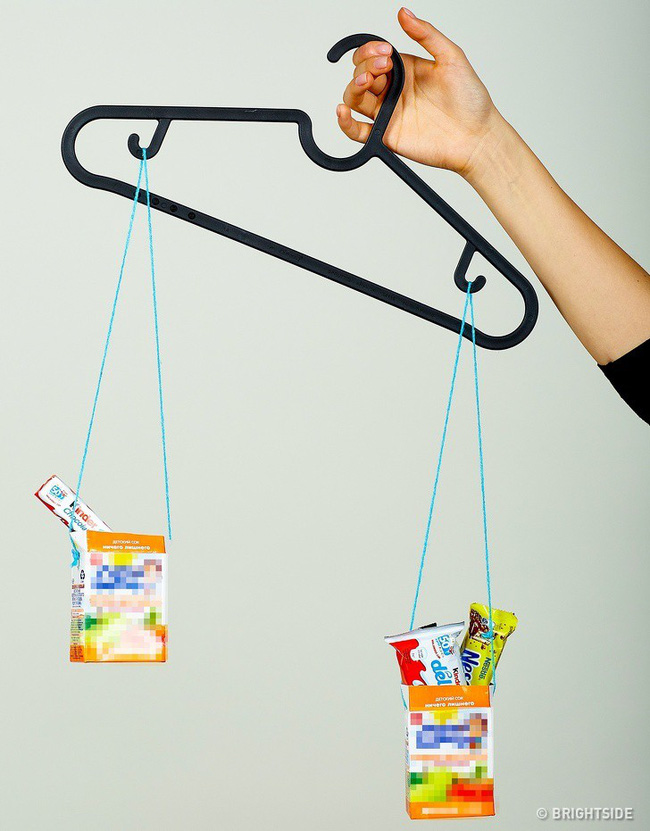 Lấy một cái móc treo quần áo, 2 hộp đựng và những cái cốc giấy hoặc những hộp nước trái cây rỗng. Đục 2 lỗ trong các hộp đựng, luồn sợi dây thừng qua chúng và gắn nó vào móc áo. Giữ cân bằng và đổ đầy từng hộp bằng bánh, kẹo hoặc thanh sôcôla. Lúc này bọn trẻ sẽ học cách chia sẻ và ngừng cãi nhau về việc ai sẽ nhận được nhiều kẹo hơn.