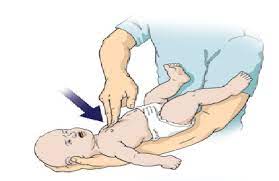 Nếu động tác vỗ lưng chưa thành công, giữ trẻ ở tư thế ngửa. Giữ đầu thấp hơn ngực. Dùng ngón trỏ và ngón giữa tay thuận ấn vuông góc xuống 1/3 dưới xương ức (từ điểm giữa của đường nối hai núm vú, đi xuống dưới khoảng 1 đốt ngón tay). Ấn dứt khoát 5 lần liên tiếp, tốc độ 1 lần ấn/ giây.