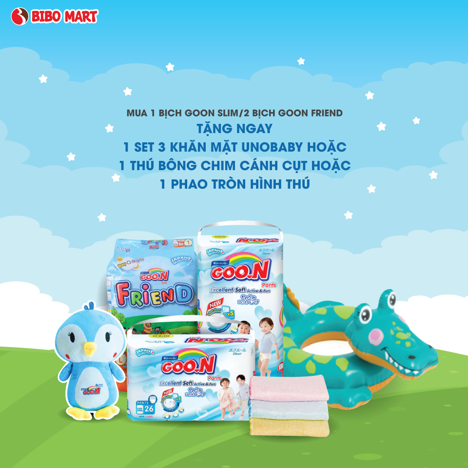 Mua 1 bịch GOO.N Slim đại hoặc 2 bịch GOO.N Friend đại Tặng 1 trong các quà sau: Set 3 khăn mặt Unobaby hoặc 1 thú bông chim cánh cụt hoặc 1 phao bơi tròn hình thú.