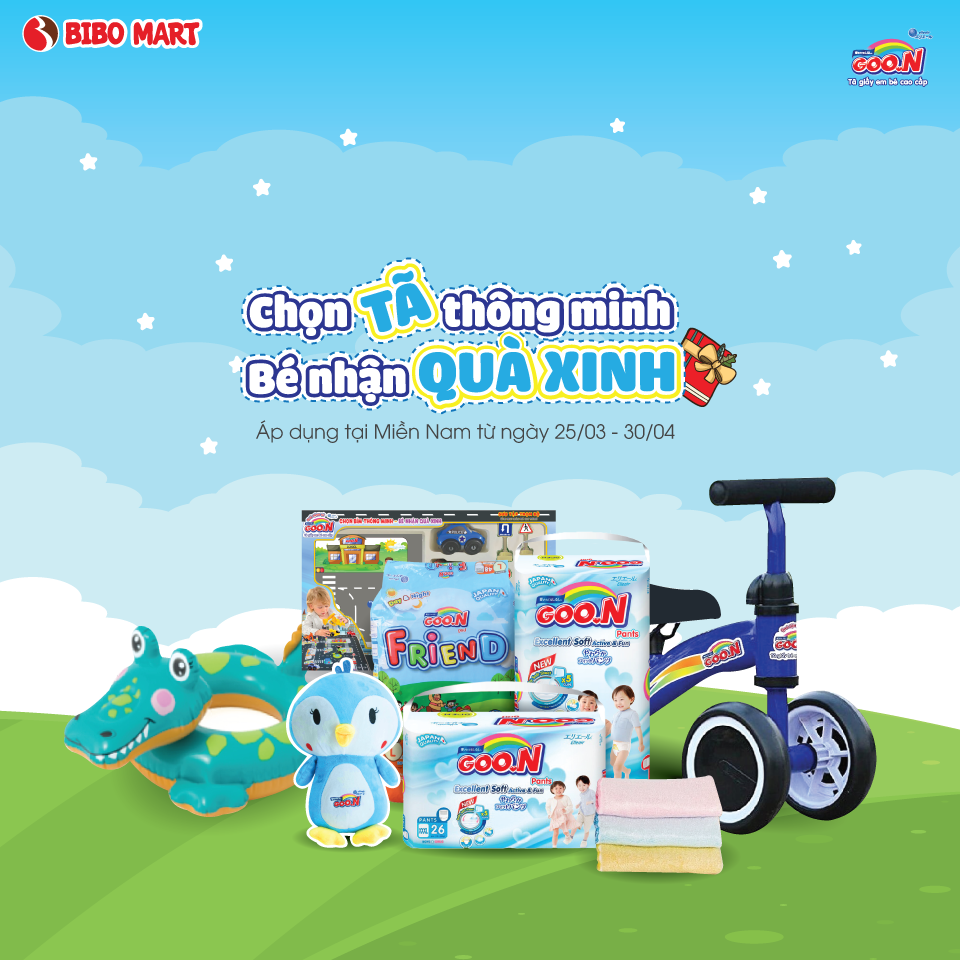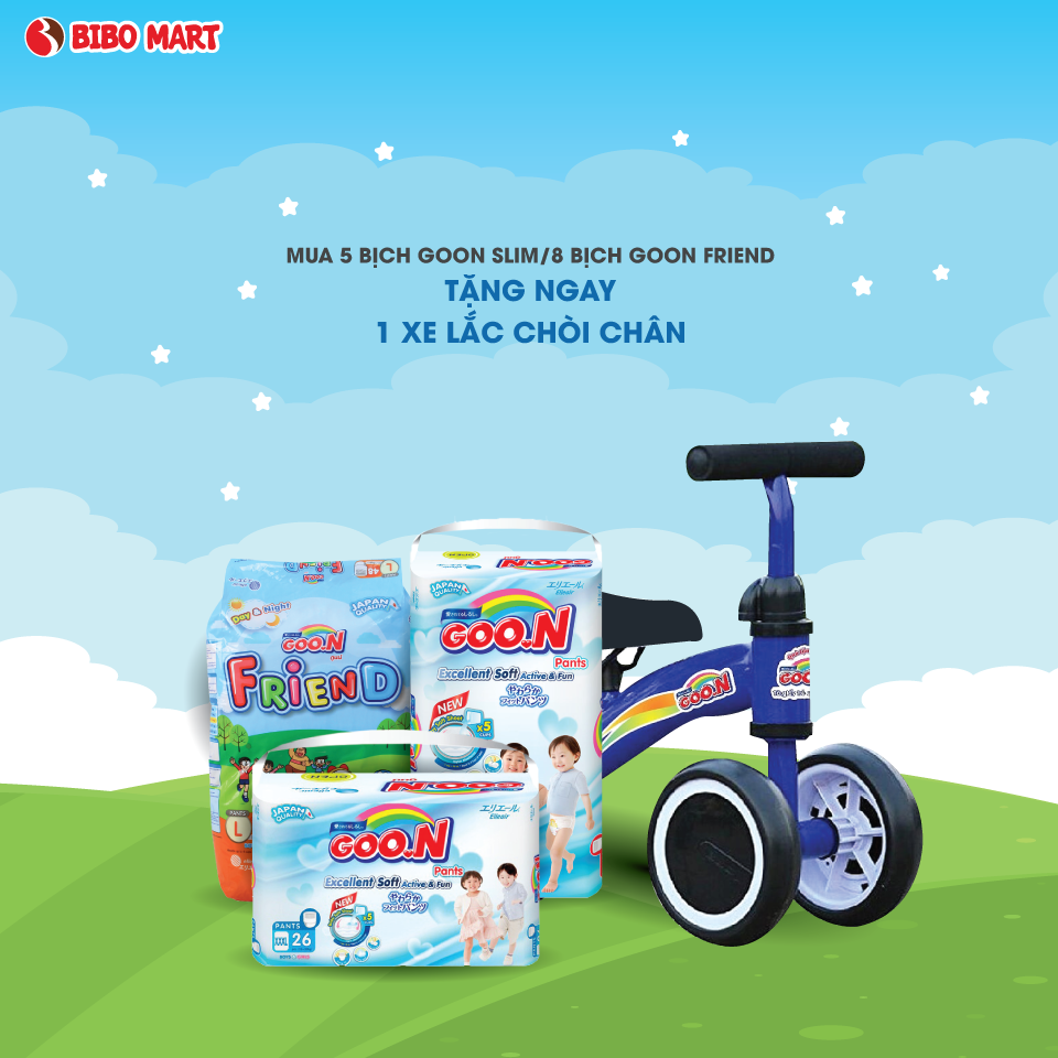– Mua 5 bịch GOO.N Slim đại hoặc 8 bịch GOO.N Friend đại Tặng 1 xe chòi chân 4 bánh cho bé.