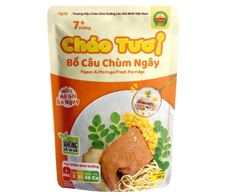 - Sự kết hợp hoàn hảo giữa bồ câu và chùm ngây tạo nên món cháo tươi thơm ngon, đậm đà, giữ trọn hương vị và dưỡng chất tự nhiên mà không cần chất bảo quản. Giúp cháo giữ được độ tươi ngon lâu dài, an toàn cho bé khi sử dụng.