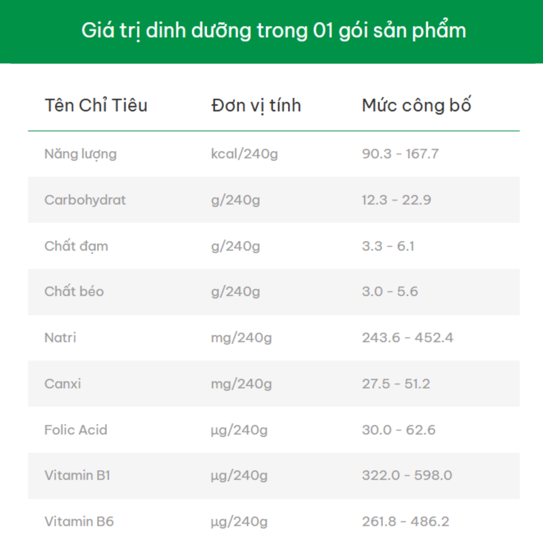 Nước hầm xương (nước, xương gà), gạo tấm (10%), thịt bồ câu (6%), nấm bào ngư, đậu xanh, hành tây, đậu lăng (1%), bột lá chùm ngây (0.5%), rau ngót, gừng, dầu thực vật, muối, đường, hương liệu (tổng hợp), Calcium carbonate, Vitamin B1 (Thiamine Mononitrate), Vitamin B6 (Pyridoxine Hydrochloride), Folic Acid (N - Pteroyl - L - glutamic Acid), chất xơ hòa tan dạng FOS (0.2%), DHA (Docosahexaenoic Acid) 0.025%.