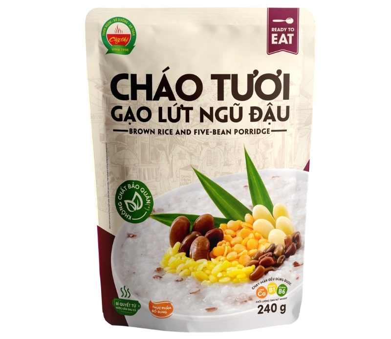 - Cháo được nấu từ gạo lứt, 5 loại đậu dinh dưỡng và rau củ tự nhiên, không chất bảo quản, không phụ gia đảm bảo an toàn tuyệt đối cho trẻ nhỏ, mẹ bầu và người ăn chay.