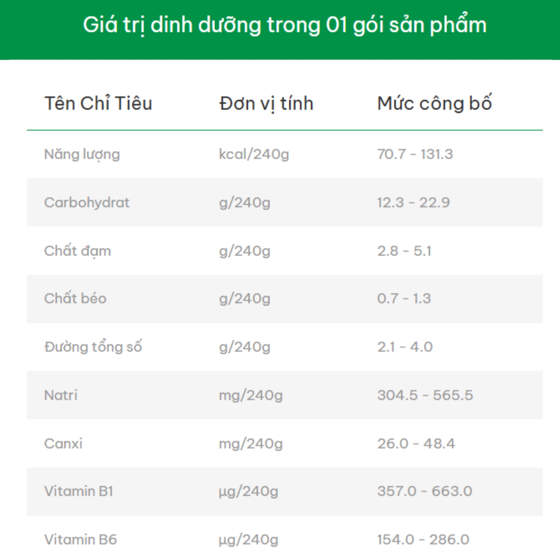 Nước hầm rau củ (hành tây (1%) củ cải 1%, mía 1%), gạo lứt huyết rồng (7%), gạo tấm (5%), đậu đỏ (5%), đậu đỏ tây (3.5%), đậu trắng tây (3.5%), đậu xanh (2%), đậu lăng (1%), dầu thực vật, hành tím, gừng, muối, đường, chất điều vị (INS 621), bột gạo đỏ lên men, Calcium carbonate, Vitamin B1 (Thiamine mononitrate), Vitamin B6 (Pyridoxine hydrochloride)