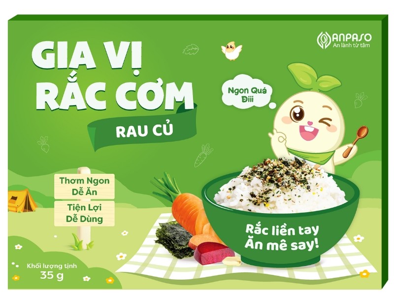 - Gia vị rắc cơm Anpaso vị rau củ có công thức và tỉ lệ thành phần được nghiên cứu kỹ lưỡng, mang đến hương vị đậm đà cho bé ăn ngon miệng.