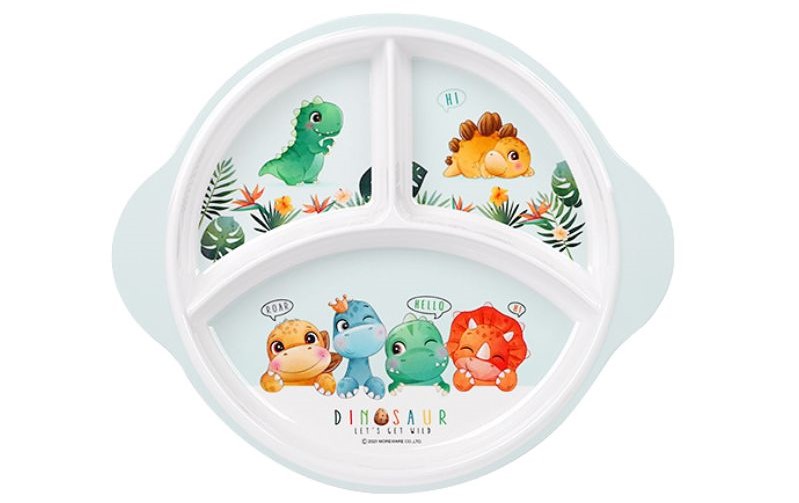 - Khay ăn cho bé hình chú khủng long màu trắng viền xanh ngộ nghĩnh, các chi tiết sống động, đáng yêu, giúp bé thích thú và ăn uống ngon miệng hơn.