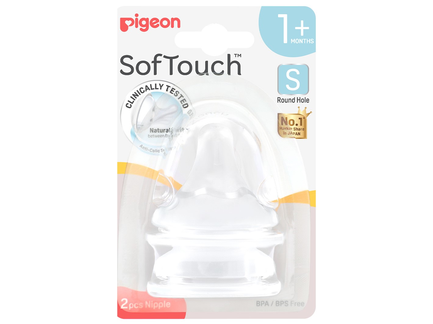 - Núm ti Pigeon SofTouch size S được làm từ cao su silicone cao cấp, mềm mại và đàn hồi tốt, không chứa BPA, đảm bảo an toàn tuyệt đối cho bé sơ sinh.