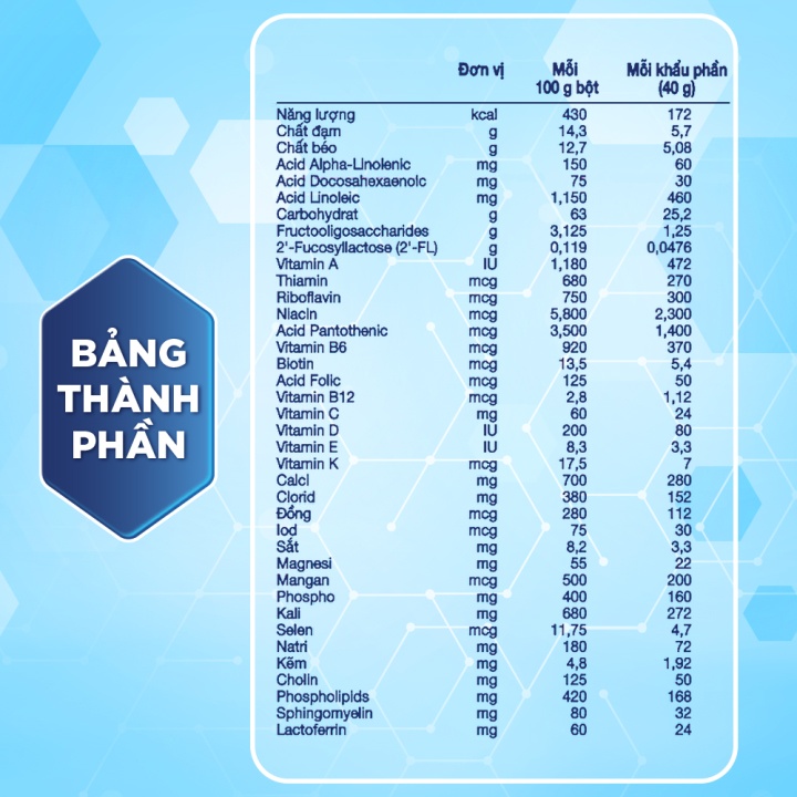 Bột sữa bơ^, sữa bột nguyên chất, maltodextrin, lactose, bột kem (lactose, dầu đậu nành, dầu dừa, đạm sữa, chất nhũ hóa mono và diglycerid của các acid béo, tri-kali citrat, di-kali hydro phosphat, ascorbyl palmitat, tocopherol), oligofructose, sữa bột tách béo, các khoáng chất (calci cacbonat, tri-calci phosphat, magnesi phosphat, sắt sulphat, natri citrat, kali citrat, kẽm sulphat, mangan sulphat, đồng sulphat, kali iodid và natri selenit), dầu cá là nguồn cung cấp acid docosahexaenoic (DHA), sirô mật bắp, các vitamin (cholin bitartrat, natri ascorbat, alpha-tocopheryl acetat, niacinamid, acid ascorbic, calci pantothenat, retinyl palmitat, cyanocobalamin, cholecalciferol, pyridoxin hydrochlorid, phytonadion, thiamin hydrochlorid, acid folic và biotin), 2'-fucosyllactose, lactoferrin và hương liệu nhân tạo (hương vani).