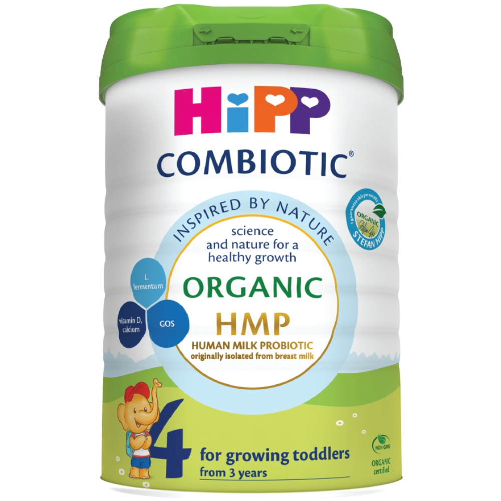 Sữa HiPP Combiotic Organic HMP & GOS số 4 800g mang đến nguồn dinh dưỡng công thức cho bé trên 3 tuổi với sự kết hợp độc đáo giữa HMP và GOS - đã được chứng minh hỗ trợ hệ miễn dịch khỏe mạnh hơn. Sản phẩm sữa bột công thức hữu cơ Organic từ HiPP Đức: không thực phẩm biến đổi gen, không kháng sinh để phòng bệnh, không thuốc trừ sâu, không phân bón hóa học và không hormone tăng trưởng. Sữa chứa hàm lượng Vitamin D và Canxi góp phần củng cố sự phát triển của hệ xương và răng. Sản phẩm từ thương hiệu HiPP với hơn 50 năm đã dành tất cả sự quan tâm và kinh nghiệm để sản xuất ra công thức sữa tốt nhất, cam kết chỉ sử dụng nguyên liệu hữu cơ và kiểm soát chặt chẽ toàn bộ quy trình sản xuất để mang lại những sản phẩm an toàn nhất cho mẹ và bé.