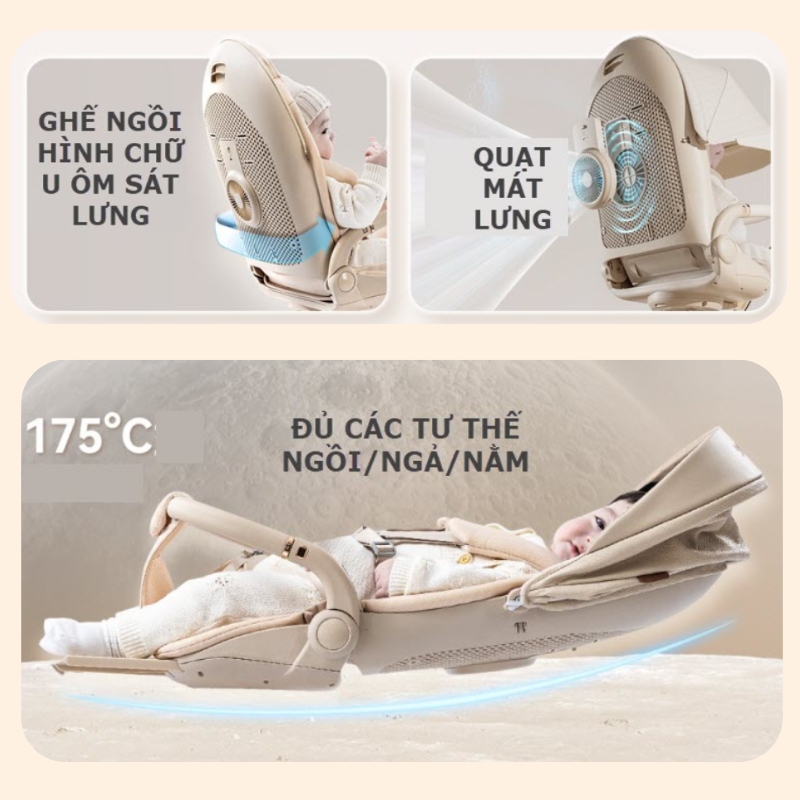Xe đẩy Vinng Q11 được trang bị hệ thống quạt làm mát lưng 3 chế độ, giúp bé luôn cảm thấy dễ chịu, đặc biệt trong những ngày hè nóng bức: